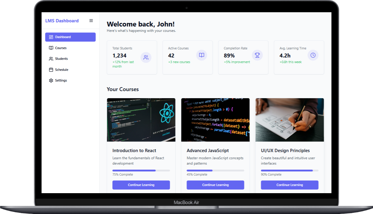 Our LMS provides an intuitive interface for educators and learners, offering tools to manage courses, track progress, and deliver engaging learning experiences.